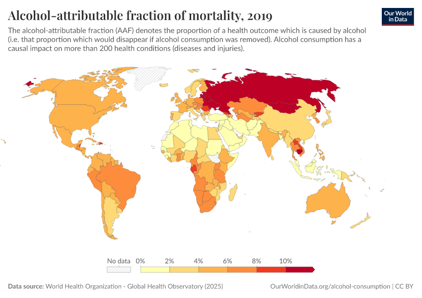 In the chart, we see estimates of the alcohol-attributable fraction (AAF), which is the proportion of deaths that are caused or exacerbated by alcohol (i.e., that proportion that would disappear if alcohol consumption was removed). We see that the proportion of deaths attributed to alcohol consumption is lower in North Africa and the Middle East and much higher in Eastern Europe.