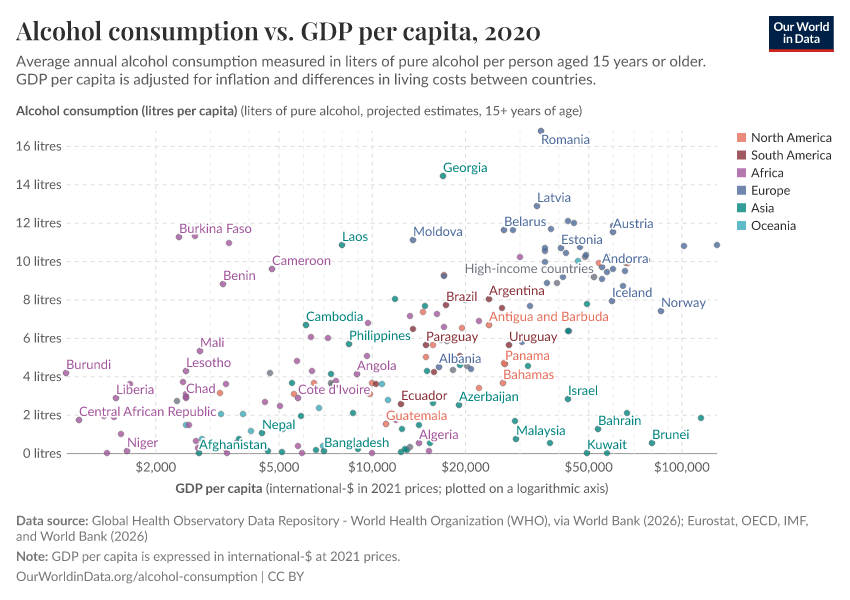 This interactive map shows the annual average alcohol consumption of alcohol, expressed per person aged 15 years or older. To account for the differences in alcohol content of different alcoholic drinks (e.g., beer, wine, spirits), this is reported in liters of pure alcohol per year.