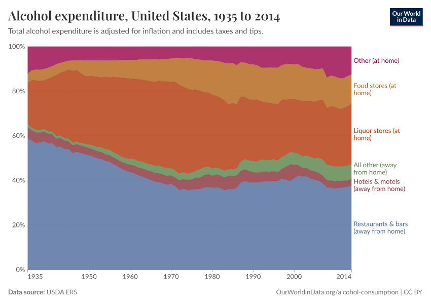This shows the expenditure on alcohol in the United States, differentiated by where the alcohol has been purchased and consumed.