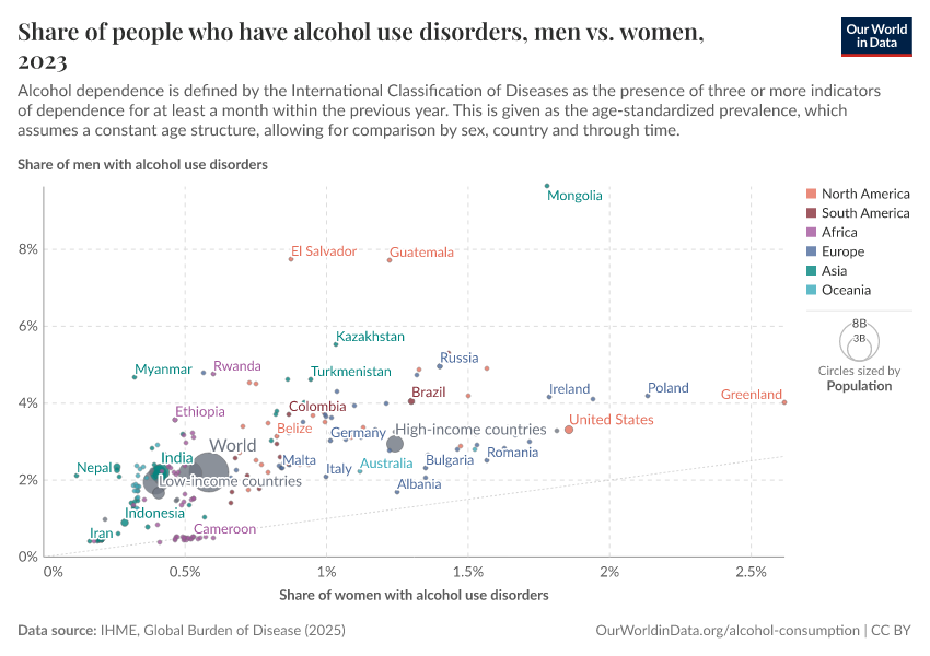 The scatter plot compares the prevalence of alcohol use disorders in males versus that of females. The prevalence of alcohol dependence in men is typically higher than in women across all countries.