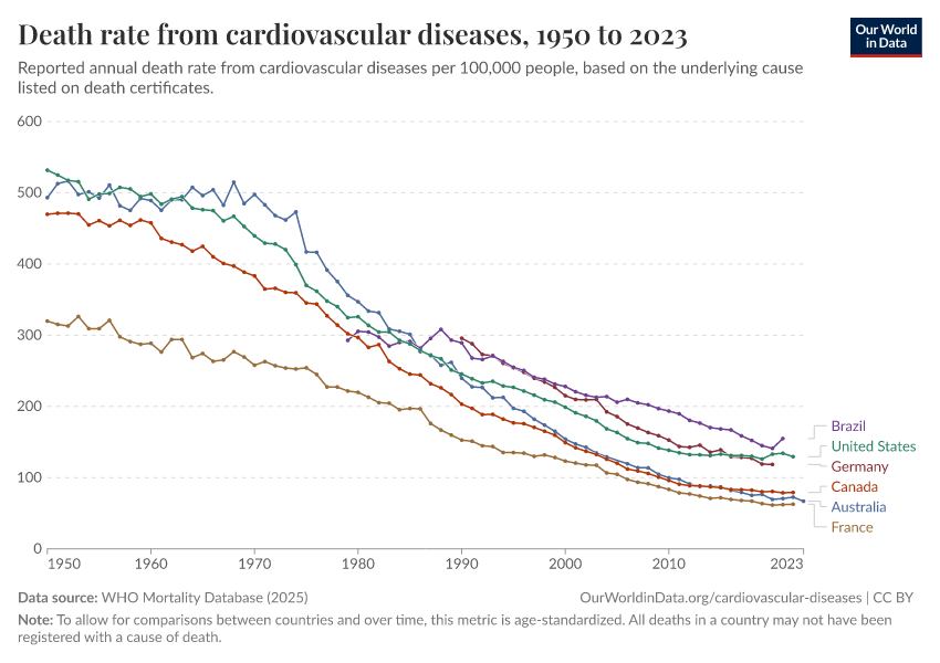 In the United States alone, the age-standardized death rate from cardiovascular disease has fallen by three-quarters since 1950. This means that for people of the same age, the annual risk of dying from cardiovascular disease is now just one-quarter what it was in 1950.