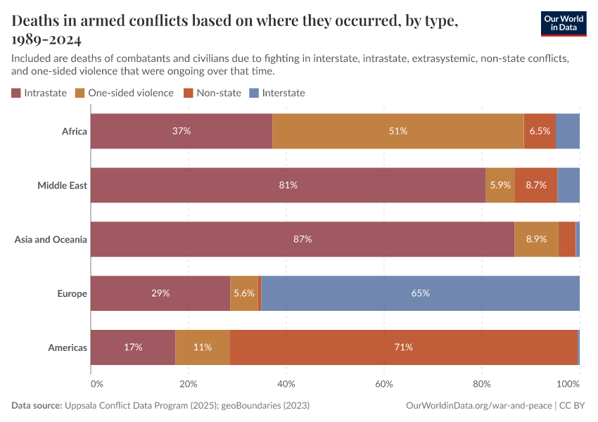 The chart shows, by region, the share of deaths each conflict type is responsible for.