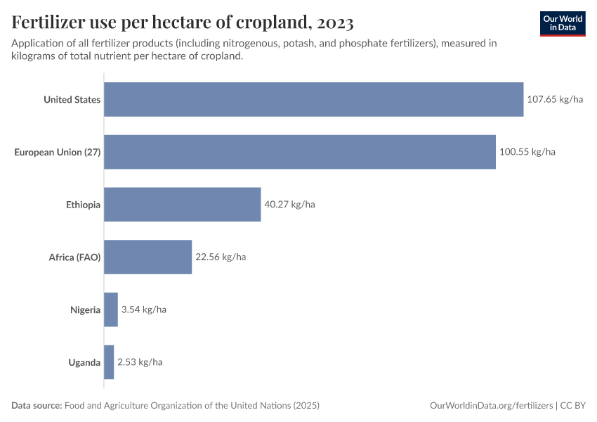 The European Union and the United States use about five times as much fertilizer per hectare as the African average. Within Africa, many countries use much less than this — as little as a few kilograms per hectare. Some lower-income countries use almost no fertilizers or pesticides and have little to regulate. This is shown in the chart below.