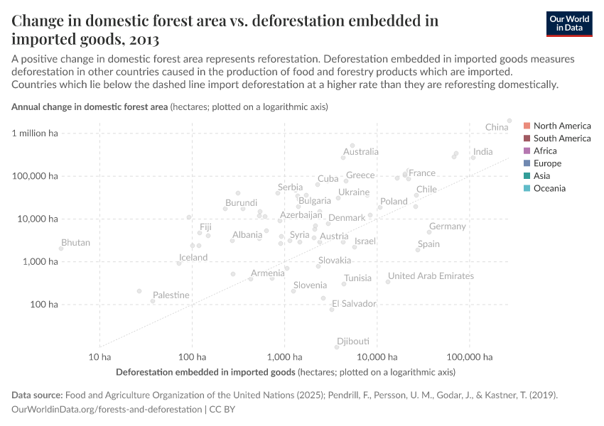 In the chart we see the comparison between the change in domestic forest area, and deforestation driven by imported goods.5 On the vertical axis we have the domestic change in forest area: this is shown only for countries where the forest area is increasing. Since there is often year-to-year variability in deforestation or reforestation rates, this is shown as the five-year average. On the x-axis we have imported deforestation. The grey line marks where the area of domestic regrowth of forests is exactly equal to imported deforestation. Countries that lie along this line would have a net-neutral impact on global forests: the area they are causing to deforestation overseas is exactly as large as the area they are regrowing at home.
