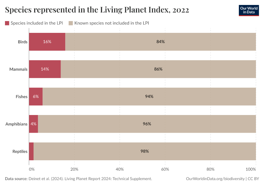 The LPI only includes data from vertebrate populations. This includes mammals, birds, reptiles, amphibians, and fish. Taxonomic groups including insects, corals, fungi, and plants are not included.