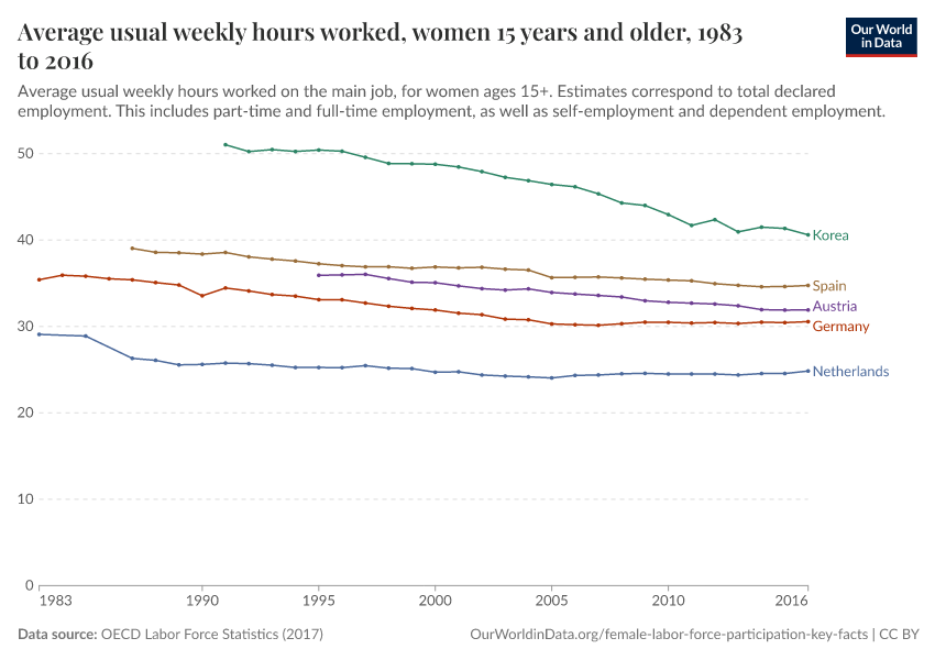 The chart here provides some clues. It shows several decades of changing average weekly hours worked for women in a selection of OECD countries. As we can see, most countries show negative trends, which is consistent with the trends for the population as a whole. However, some of these trends are still remarkable if we take into account the substantial increase in female participation taking place at the same time.