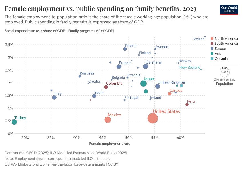 In the chart here, we show that female employment, measured as the employment-to-population ratios for women 15+, tends to be higher in countries with higher levels of public spending on family benefits (i.e. child-related cash transfers to families with children, public spending on services for families with children, and financial support for families provided through the tax system, including tax exemptions).