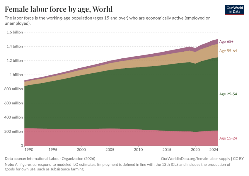 As we can see, today the number of women in the global labor force who are younger than 25 is slightly less than what it was in the year 2000. However, the global female labor force grew by almost 40% over the same period.