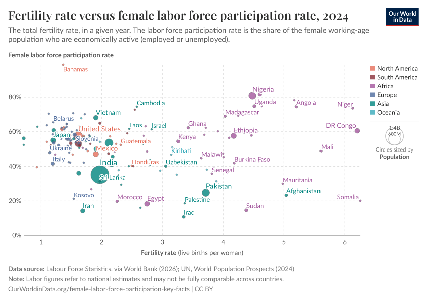 On average, mothers around the world continue to spend more time on childcare than fathers. Because of this, fewer children per woman – lower fertility rates – can theoretically free up women's time and contribute to an increase in female labor force participation.