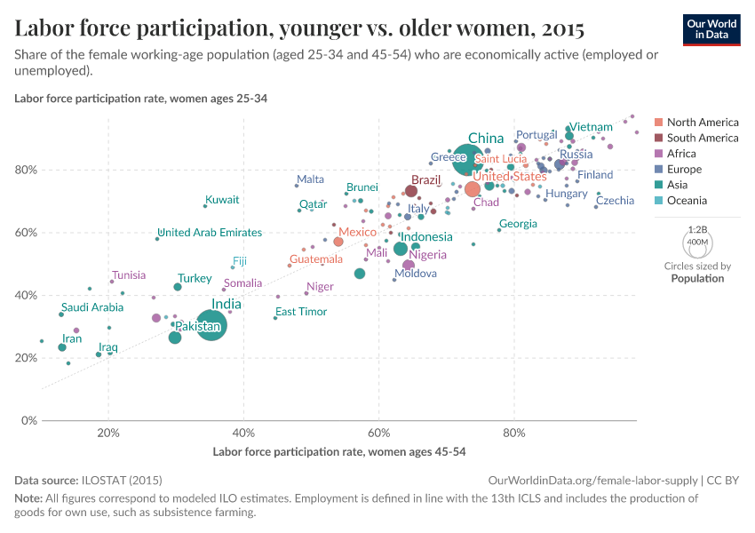 As we can see, very few countries lie on the diagonal line, so in most cases, female labor force participation is not constant across age groups.