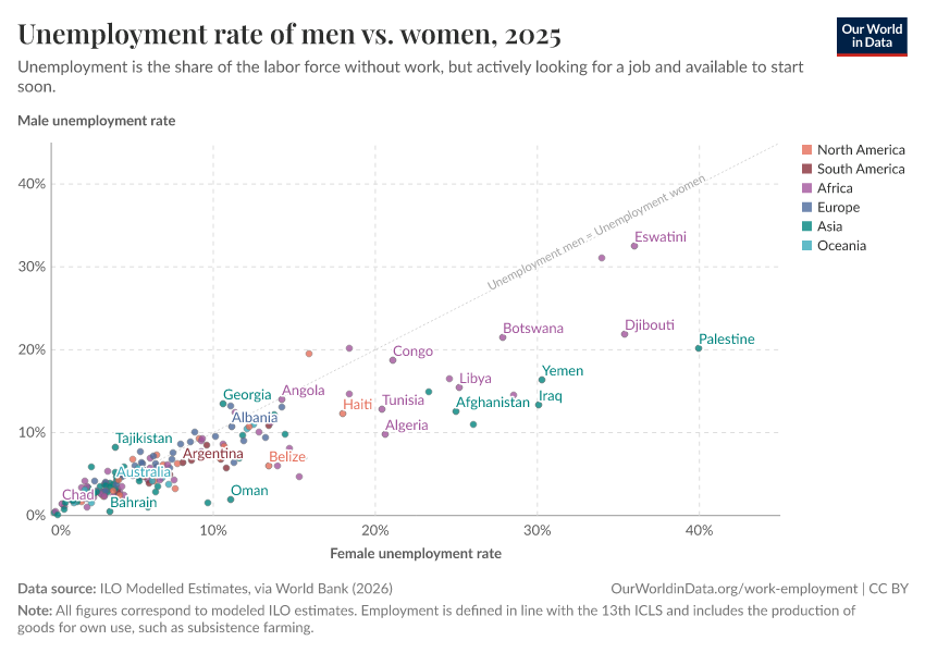 However, on the right-hand side of the chart, most countries lie significantly above the diagonal line – so in countries where unemployment is more common, women tend to be disproportionately affected.
