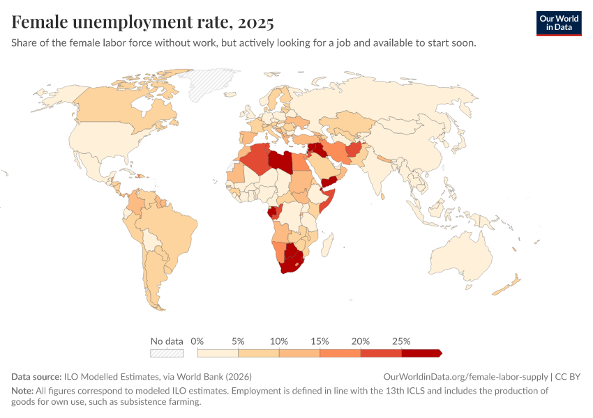 The map shows unemployment rates for women across the world. As we can see, the highest female unemployment rates correspond to the countries with the lowest female labor force participation, notably in North Africa and the Middle East.