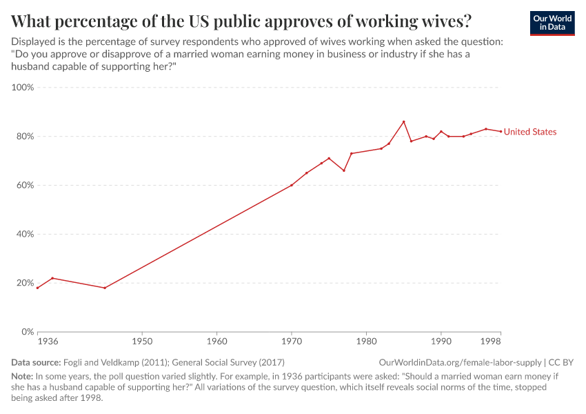In fact, discrimination and biases operate in many other ways, permeating all spheres of life. As the chart here shows, at the end of World War II, only 18% of people in the US thought that a wife should work if her husband was able to support her. Indeed, it is not surprising that around this time, female labor supply in market activities was low, and demand-side barriers were high. As this chart shows, female labor supply started increasing in the US alongside changing social norms: people's approval of married women working went up during a period of remarkable growth in female labor force participation and then flattened at around the same time that participation stalled. For more details on this see Fortin (2015) and Goldin and Katz (2016)31.