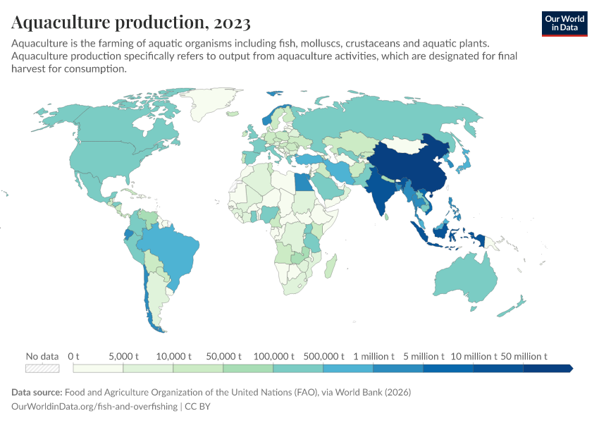 The chart here shows the distribution of wild fish catch by country. This is total seafood production minus aquaculture (fish farming).