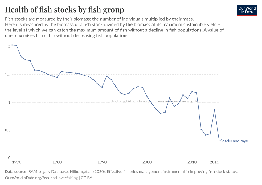 Underfished: this is when the fish stock is greater than the biomass that would produce the maximum sustainable yield. We could catch more fish without the decline of fish populations. From a resource point of view, this is suboptimal because we’re missing out on a key food source and income source from fishing communities.