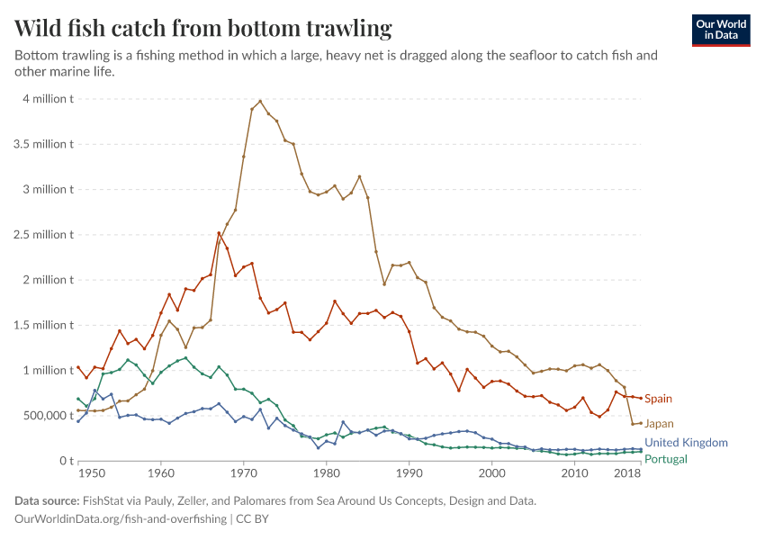 In contrast, bottom trawling is becoming less common across Europe. In many countries – such as the UK, Spain, and Portugal – bottom trawling was intense throughout the 1950s, 60s, and 70s but has since declined significantly. That has been partly driven by efforts to reduce overfishing and allow fish stocks to rebuild. In addition, the European Commission banned bottom trawling in deep waters – those below 800m in depth – in 2016.
