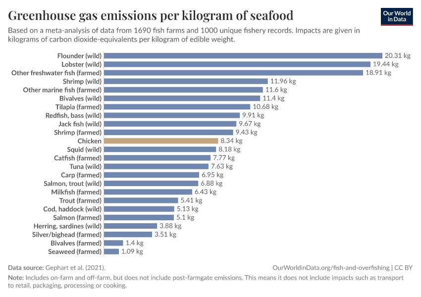 Our comparison of greenhouse gas emissions includes both wild-caught seafood and seafood from fish farms. Land use, nitrogen and phosphorus emissions, and freshwater use are only shown for farmed seafood – wild-caught fish do not really create these environmental impacts. Farmed fish do require land and can produce nutrient pollution from the production of feed to grow them.