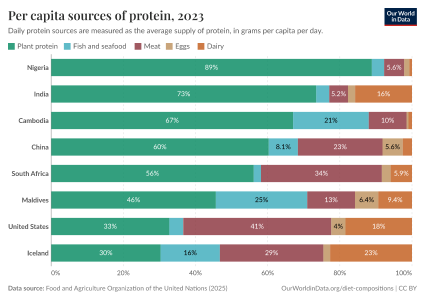 In some countries, seafood dominates. It accounts for the majority of animal protein in Cambodia, Bangladesh, and the Maldives.