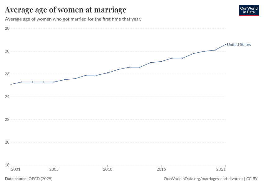 OECD (2025) – with minor processing by Our World in Data. “Average age of women at marriage” [dataset]. OECD, “OECD Family Database - Marriage and Divorce Rates” [original data]. Retrieved January 16, 2026 from https://owid-bot-svg-tester-thumbnai.owid.pages.dev/grapher/age-at-marriage-women