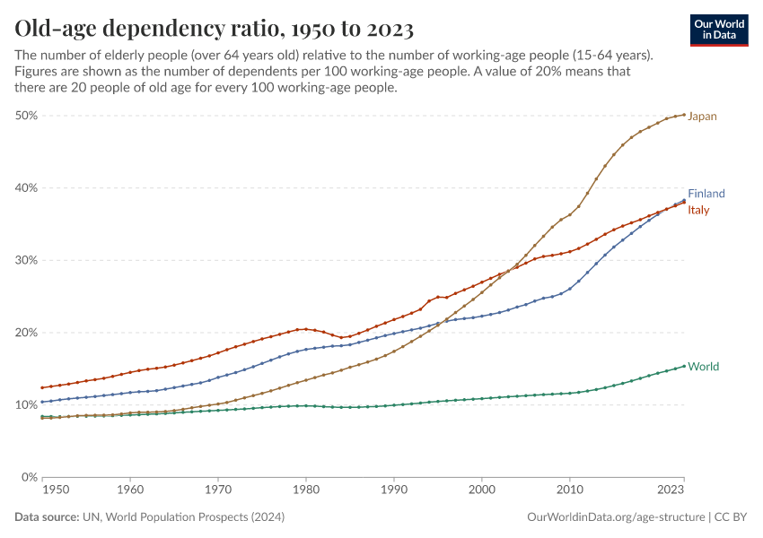 UN, World Population Prospects (2024) – processed by Our World in Data. “Old-age dependency ratio, age old – UN WPP” [dataset]. United Nations, “World Population Prospects” [original data]. Retrieved January 16, 2026 from https://owid-bot-svg-tester-thumbnai.owid.pages.dev/grapher/age-dependency-ratio-old