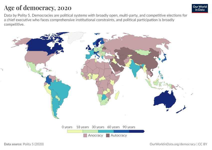 “Data Page: Age of democracy”, part of the following publication: Bastian Herre, Lucas Rodés-Guirao, and Esteban Ortiz-Ospina (2013) - “Democracy”. Data adapted from Polity 5. Retrieved from https://owid-bot-svg-tester-thumbnai.owid.pages.dev/grapher/age-of-democracy-polity [online resource]How to cite this data