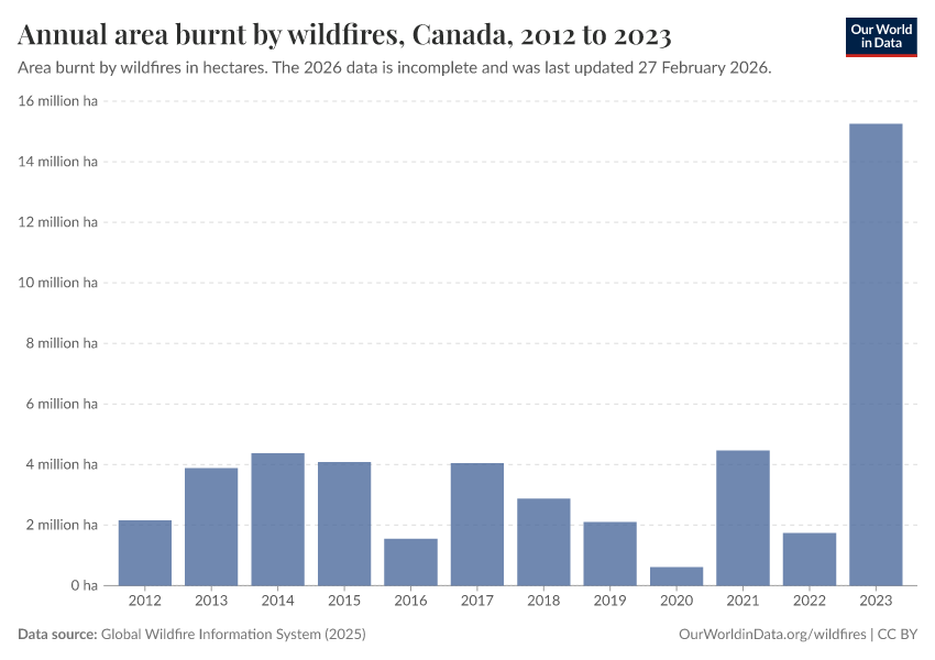 “Data Page: Annual area burnt by wildfires”, part of the following publication: Hannah Ritchie, Pablo Rosado, and Veronika Samborska (2024) - “Climate Change”. Data adapted from Global Wildfire Information System. Retrieved from https://owid-bot-svg-tester-thumbnai.owid.pages.dev/grapher/annual-area-burnt-by-wildfires [online resource]How to cite this data