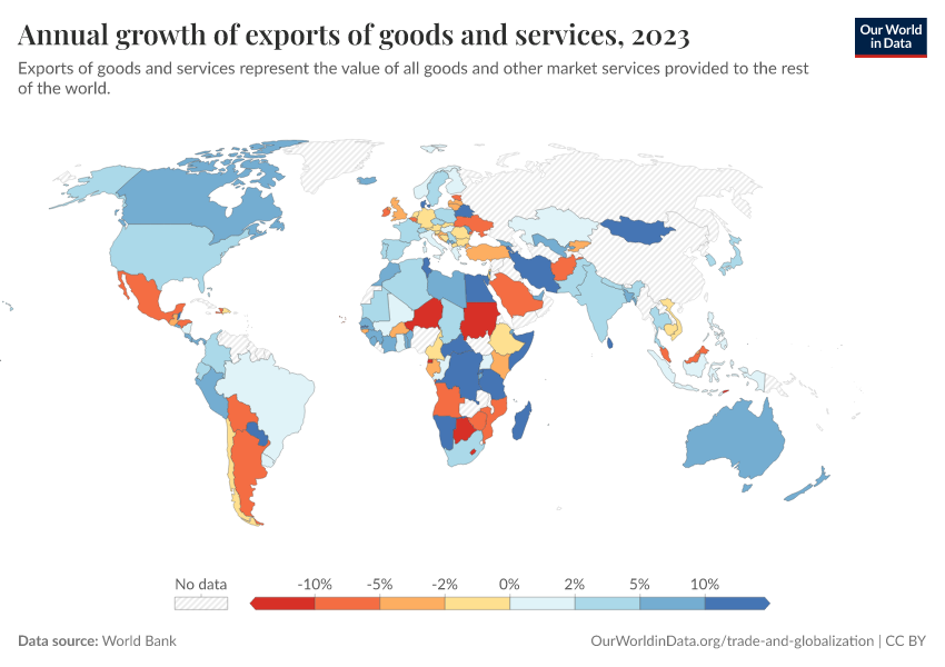 “Data Page: Annual growth of exports of goods and services”. Our World in Data (2026). Data adapted from World Bank. Retrieved from https://owid-bot-svg-tester-thumbnai.owid.pages.dev/grapher/annual-growth-of-exports-of-goods-and-services [online resource]How to cite this data