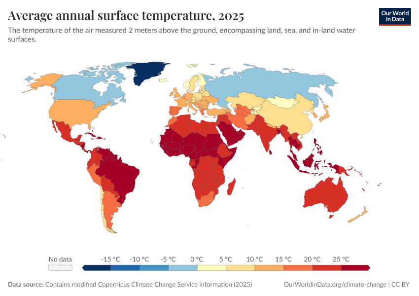Contains modified Copernicus Climate Change Service information (2025) – with major processing by Our World in Data. “Average annual surface temperature” [dataset]. Contains modified Copernicus Climate Change Service information, “ERA5 monthly averaged data on single levels from 1940 to present 2” [original data]. Retrieved January 16, 2026 from https://owid-bot-svg-tester-thumbnai.owid.pages.dev/grapher/average-annual-surface-temperature