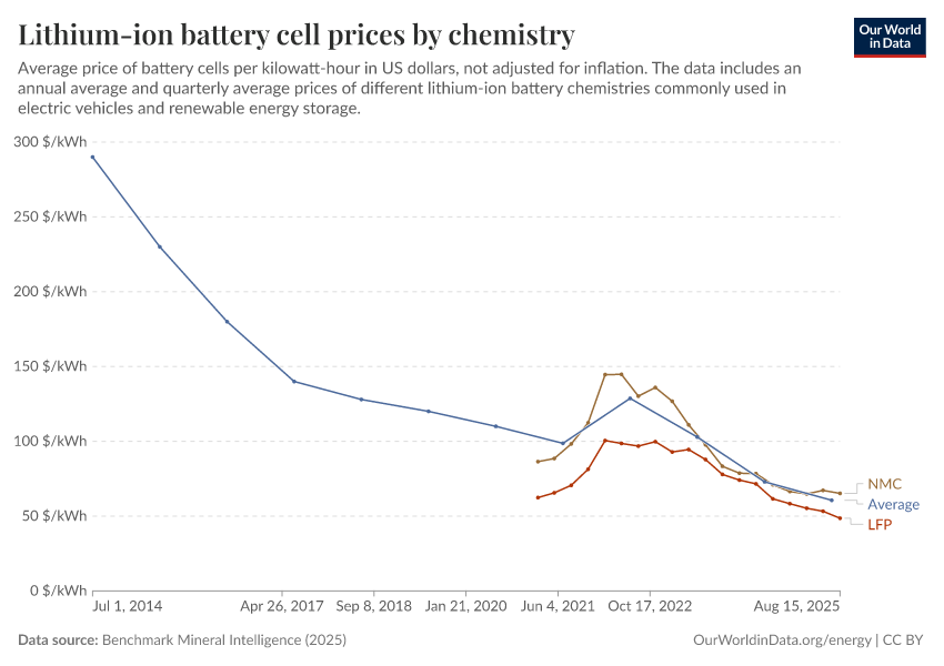 Benchmark Mineral Intelligence (2025) – with minor processing by Our World in Data. “Lithium-ion battery cell prices by chemistry” [dataset]. Benchmark Mineral Intelligence, “Lithium-ion battery prices”; Benchmark Mineral Intelligence, “Battery prices by chemistry” [original data]. Retrieved January 16, 2026 from https://owid-bot-svg-tester-thumbnai.owid.pages.dev/grapher/average-battery-cell-price