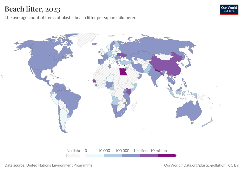 United Nations Environment Programme – processed by Our World in Data. “Beach litter” [dataset]. United Nations Environment Programme, “Data from multiple sources” [original data]. Retrieved January 16, 2026 from https://owid-bot-svg-tester-thumbnai.owid.pages.dev/grapher/beach-litter