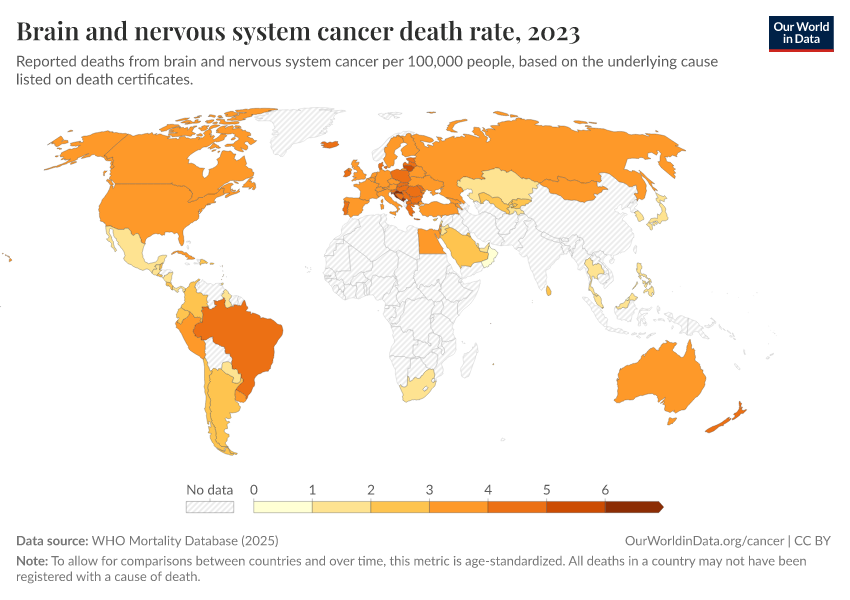 WHO Mortality Database (2025) – with minor processing by Our World in Data. “Brain and nervous system cancer death rate” [dataset]. WHO Mortality Database, “WHO Mortality Database” [original data]. Retrieved January 16, 2026 from https://owid-bot-svg-tester-thumbnai.owid.pages.dev/grapher/brain-and-nervous-system-cancer-death-rate