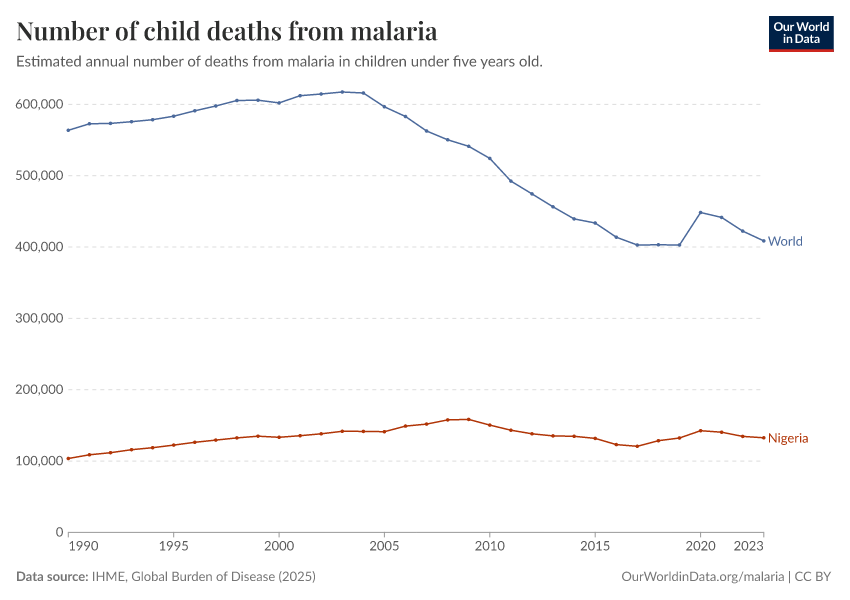 “Data Page: Number of child deaths from malaria”, part of the following publication: Esteban Ortiz-Ospina and Max Roser (2016) - “Global Health”. Data adapted from IHME, Global Burden of Disease. Retrieved from https://owid-bot-svg-tester-thumbnai.owid.pages.dev/grapher/child-deaths-from-malaria-number [online resource]How to cite this data