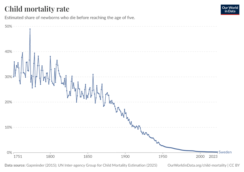 Gapminder (2015); UN Inter-agency Group for Child Mortality Estimation (2025) – processed by Our World in Data. “Child mortality rate – Gapminder; UN IGME – Long-run data” [dataset]. United Nations Inter-agency Group for Child Mortality Estimation, “United Nations Inter-agency Group for Child Mortality Estimation”; Gapminder, “Child mortality rate under age five v7”; Gapminder based on UN IGME & UN WPP, “Under-five Mortality v11”; Various sources, “Population” [original data]. Retrieved January 16, 2026 from https://owid-bot-svg-tester-thumbnai.owid.pages.dev/grapher/child-mortality