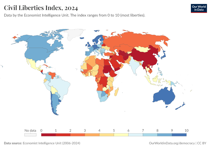 Economist Intelligence Unit (2006-2024) – processed by Our World in Data. “Civil Liberties Index” [dataset]. Economist Intelligence Unit, “Democracy Index 2021: The China challenge”; Economist Intelligence Unit, “Democracy Index 2022: Frontline democracy and the battle for Ukraine”; Economist Intelligence Unit, “Democracy Index 2023: Age of Conflict”; Economist Intelligence Unit, “Democracy Index 2024: What's wrong with representative democracy?”; Gapminder, “Democracy Index v4”; Various sources, “Population” [original data]. Retrieved January 16, 2026 from https://owid-bot-svg-tester-thumbnai.owid.pages.dev/grapher/civil-liberties-index-eiu