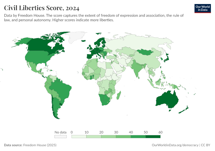 Freedom House (2025) – processed by Our World in Data. “Civil liberties score” [dataset]. Freedom House, “Freedom in the World” [original data]. Retrieved January 16, 2026 from https://owid-bot-svg-tester-thumbnai.owid.pages.dev/grapher/civil-liberties-score-fh