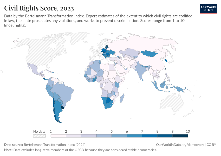 “Data Page: Civil rights score”, part of the following publication: Bastian Herre, Lucas Rodés-Guirao, and Esteban Ortiz-Ospina (2013) - “Democracy”. Data adapted from Bertelsmann Transformation Index. Retrieved from https://owid-bot-svg-tester-thumbnai.owid.pages.dev/grapher/civil-rights-score-bti [online resource]How to cite this data