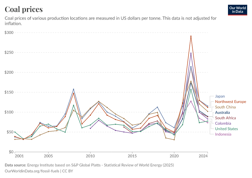 “Data Page: Coal prices”, part of the following publication: Hannah Ritchie, Pablo Rosado, and Max Roser (2023) - “Energy”. Data adapted from Energy Institute. Retrieved from https://owid-bot-svg-tester-thumbnai.owid.pages.dev/grapher/coal-prices [online resource]