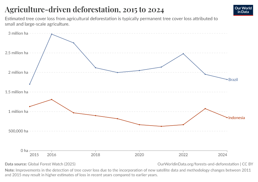 “Data Page: Agriculture-driven deforestation”, part of the following publication: Hannah Ritchie, Fiona Spooner, and Max Roser (2021) - “Forests and Deforestation”. Data adapted from Global Forest Watch. Retrieved from https://owid-bot-svg-tester-thumbnai.owid.pages.dev/grapher/commodity-driven-deforestation [online resource]How to cite this data
