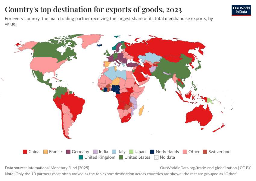 International Monetary Fund (2025) – with major processing by Our World in Data. “Top export partner category” [dataset]. International Monetary Fund, “International Trade in Goods (by partner country) (IMTS)” [original data]. Retrieved January 16, 2026 from https://owid-bot-svg-tester-thumbnai.owid.pages.dev/grapher/countrys-top-destination-for-exports-of-goods