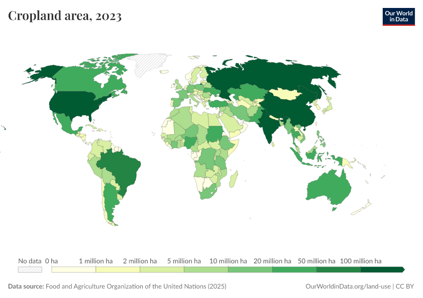“Data Page: Cropland area”, part of the following publication: Hannah Ritchie, Pablo Rosado, and Max Roser (2023) - “Agricultural Production”. Data adapted from Food and Agriculture Organization of the United Nations. Retrieved from https://owid-bot-svg-tester-thumbnai.owid.pages.dev/grapher/cropland-area [online resource]How to cite this data