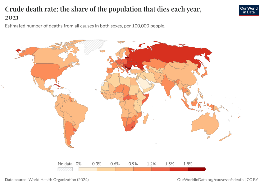 “Data Page: Crude death rate: the share of the population that dies each year”, part of the following publication: Esteban Ortiz-Ospina and Max Roser (2016) - “Global Health”. Data adapted from World Health Organization. Retrieved from https://owid-bot-svg-tester-thumbnai.owid.pages.dev/grapher/crude-death-rate-the-share-of-the-population-that-dies-each-year-who [online resource]How to cite this data