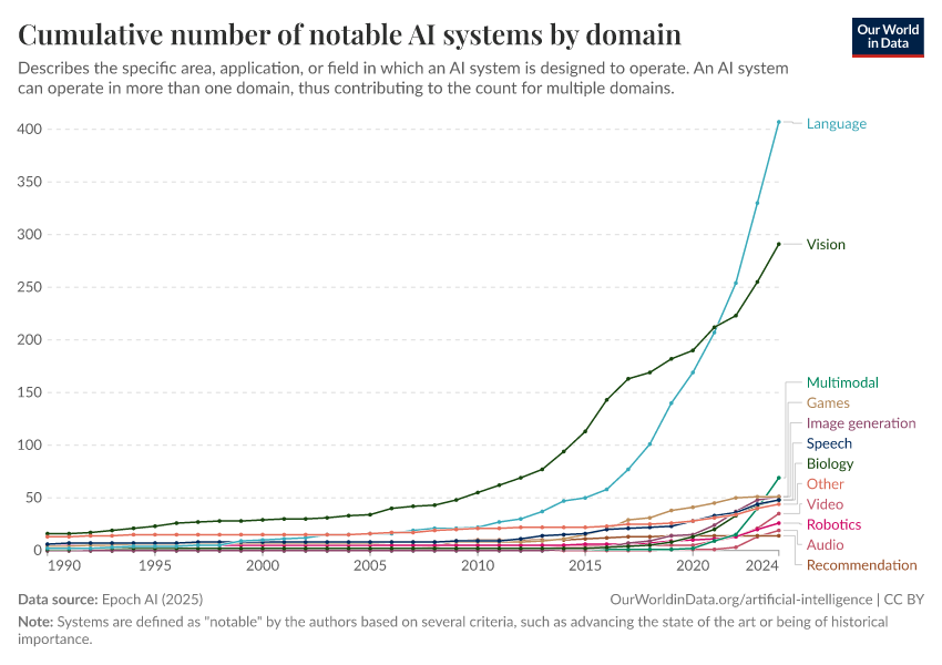 “Data Page: Cumulative number of notable AI systems by domain”, part of the following publication: Charlie Giattino, Edouard Mathieu, Veronika Samborska, and Max Roser (2023) - “Artificial Intelligence”. Data adapted from Epoch AI. Retrieved from https://owid-bot-svg-tester-thumbnai.owid.pages.dev/grapher/cumulative-number-of-notable-ai-systems-by-domain [online resource]How to cite this data