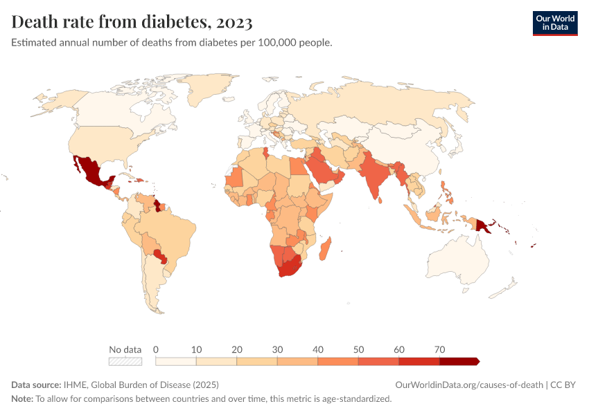 “Data Page: Death rate from diabetes”, part of the following publication: Esteban Ortiz-Ospina and Max Roser (2016) - “Global Health”. Data adapted from IHME, Global Burden of Disease. Retrieved from https://owid-bot-svg-tester-thumbnai.owid.pages.dev/grapher/death-rate-from-diabetes [online resource]How to cite this data