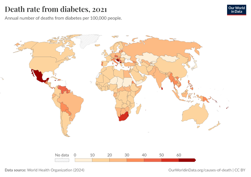 World Health Organization (2024) – with major processing by Our World in Data. “Death rate from diabetes” [dataset]. World Health Organization, “Global Health Estimates” [original data]. Retrieved January 16, 2026 from https://owid-bot-svg-tester-thumbnai.owid.pages.dev/grapher/death-rate-from-diabetes-ghe