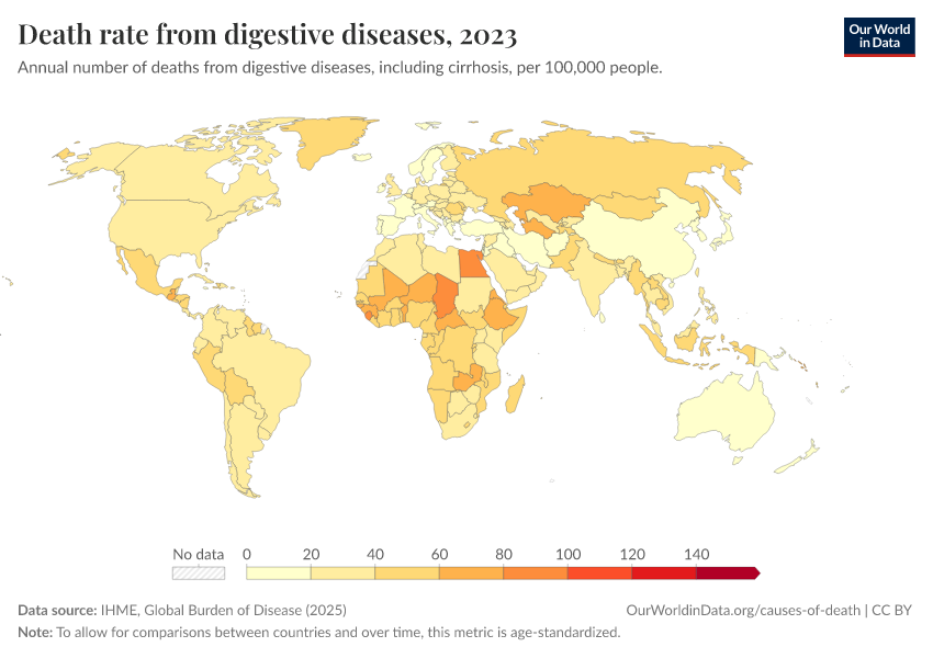 IHME, Global Burden of Disease (2024) – with minor processing by Our World in Data. “Death rate from digestive diseases” [dataset]. IHME, Global Burden of Disease, “Global Burden of Disease - Deaths and DALYs” [original data]. Retrieved January 16, 2026 from https://owid-bot-svg-tester-thumbnai.owid.pages.dev/grapher/death-rate-from-digestive-diseases