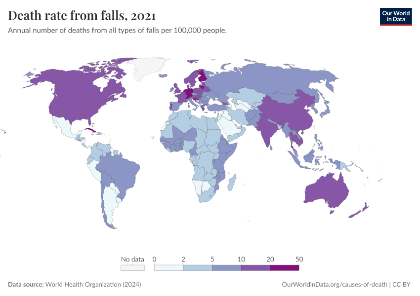 “Data Page: Death rate from falls”, part of the following publication: Esteban Ortiz-Ospina and Max Roser (2016) - “Global Health”. Data adapted from World Health Organization. Retrieved from https://owid-bot-svg-tester-thumbnai.owid.pages.dev/grapher/death-rate-from-falls [online resource]How to cite this data