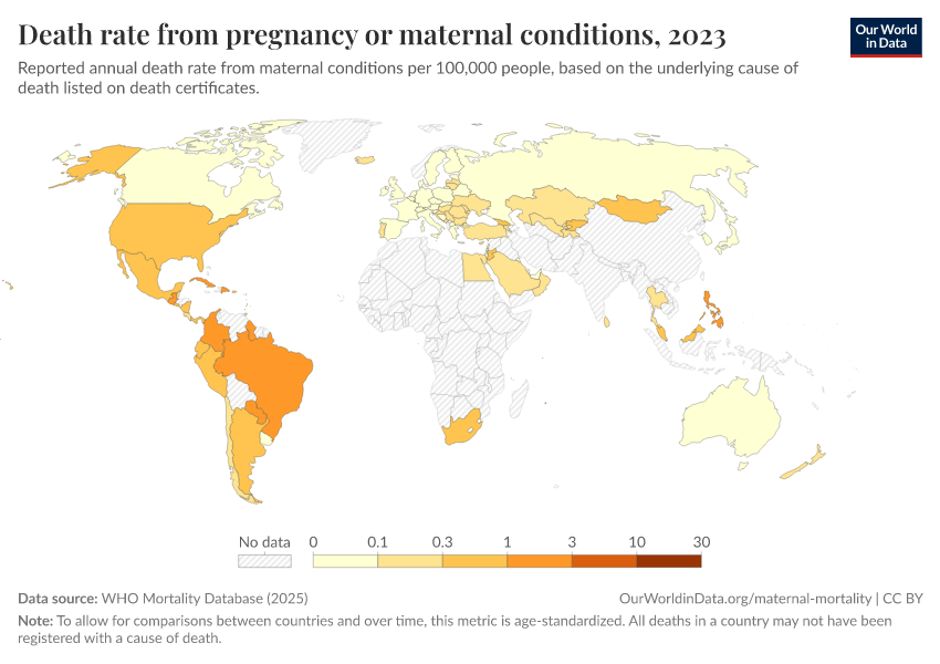WHO Mortality Database (2025) – with minor processing by Our World in Data. “Death rate from pregnancy or maternal conditions” [dataset]. WHO Mortality Database, “WHO Mortality Database” [original data]. Retrieved January 16, 2026 from https://owid-bot-svg-tester-thumbnai.owid.pages.dev/grapher/death-rate-from-maternal-disorders