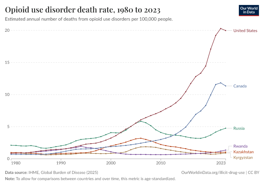 IHME, Global Burden of Disease (2024) – with minor processing by Our World in Data. “Opioid use disorder death rate” [dataset]. IHME, Global Burden of Disease, “Global Burden of Disease - Deaths and DALYs” [original data]. Retrieved January 16, 2026 from https://owid-bot-svg-tester-thumbnai.owid.pages.dev/grapher/death-rate-from-opioid-use