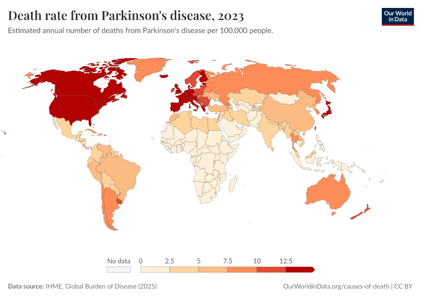 “Data Page: Death rate from Parkinson's disease”, part of the following publication: Esteban Ortiz-Ospina and Max Roser (2016) - “Global Health”. Data adapted from IHME, Global Burden of Disease. Retrieved from https://owid-bot-svg-tester-thumbnai.owid.pages.dev/grapher/death-rate-from-parkinsons-disease-gbd [online resource]How to cite this data