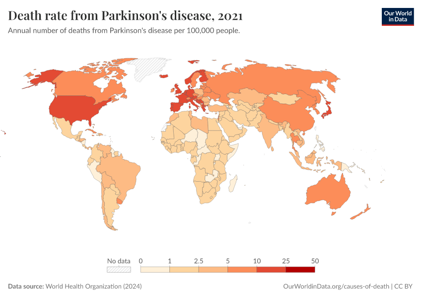 World Health Organization (2024) – with major processing by Our World in Data. “Death rate from Parkinson's disease” [dataset]. World Health Organization, “Global Health Estimates” [original data]. Retrieved January 16, 2026 from https://owid-bot-svg-tester-thumbnai.owid.pages.dev/grapher/death-rate-from-parkinsons-disease-ghe